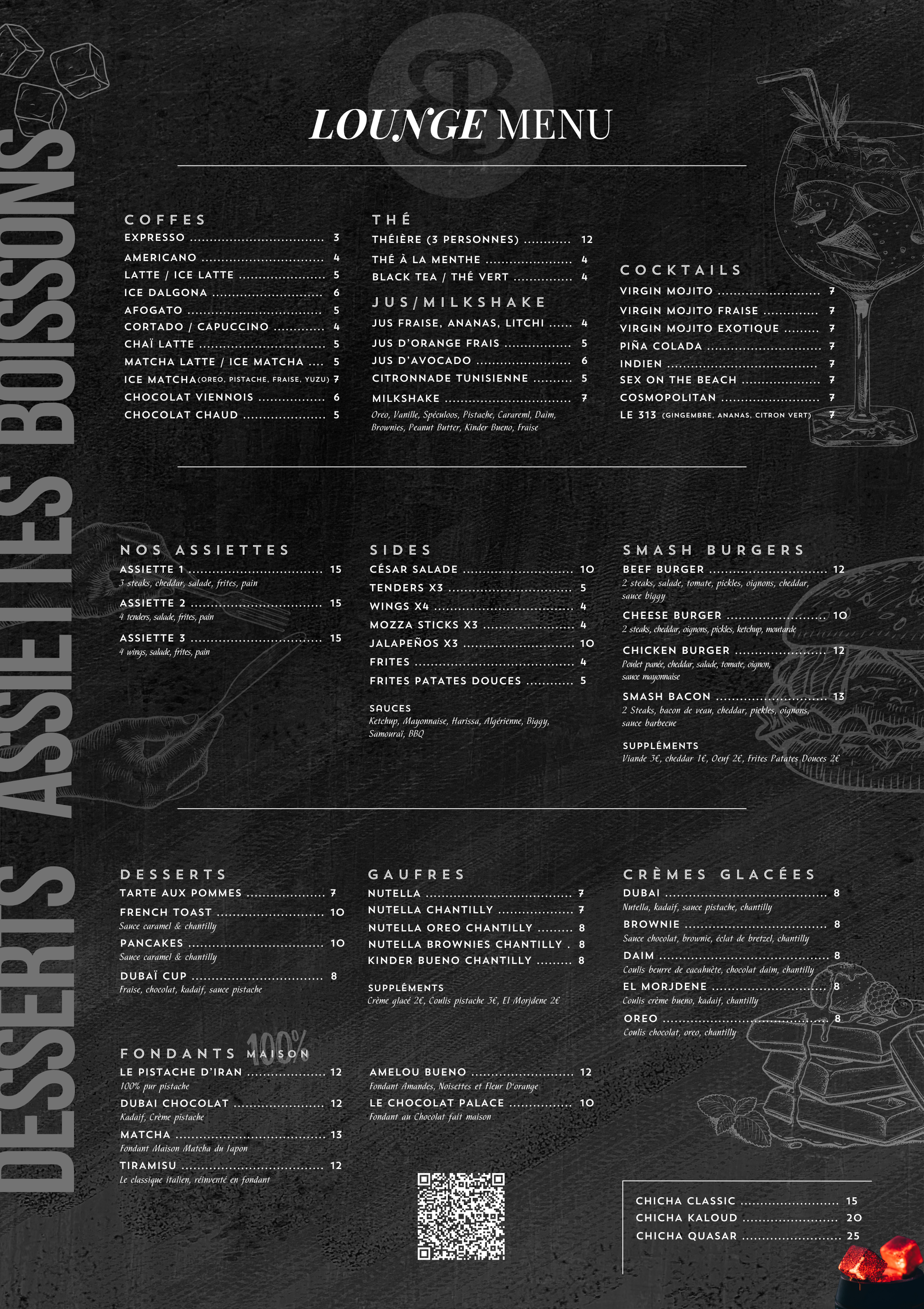 Nôtres établissement propose un service Brunch All day du mercredi au dimanche, et type fast-food en soirée spécialisé dans les smash burgers, desserts, milkshake et cocktails. Retrouvez notre service chicha bar uniquement du côté lounge en soirée.